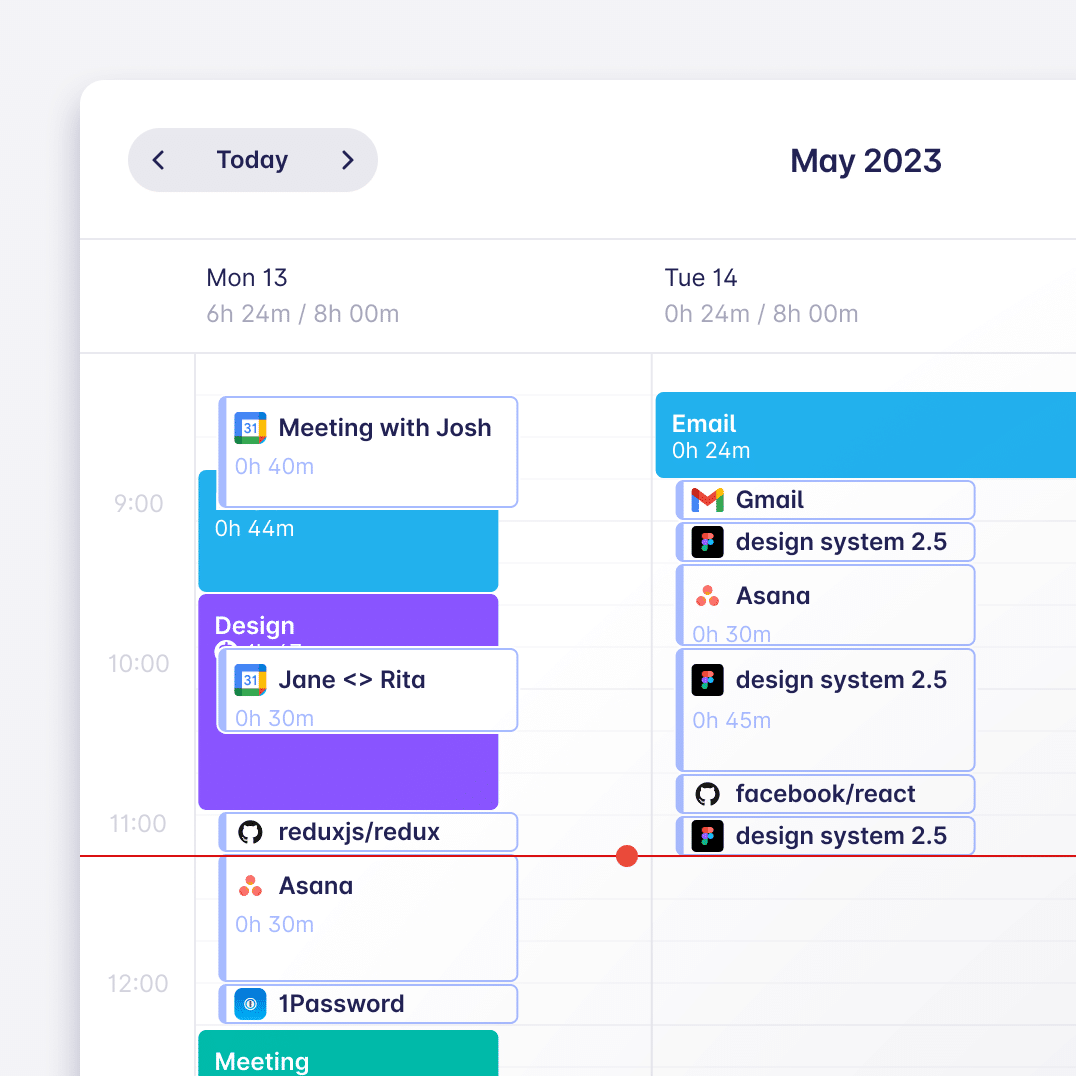 Automated time tracking is a streamlined process of recording time without manual effort. In a time tracking software like Timeular, automatic time tracking is based on scheduled events retrieved from your Calendar app, as well as from visited websites and opened apps. You can simply turn your logged activities into time entries, without the need to remember what you did on Monday morning at 11 o’clock.