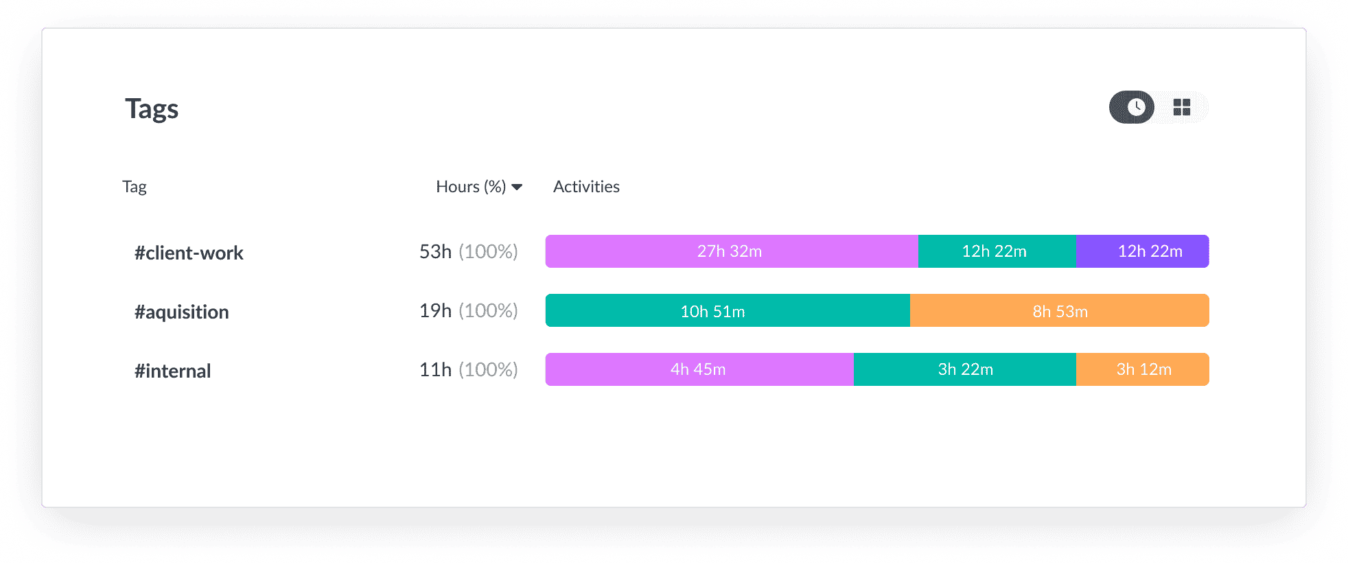 With our charts you can visualize your tagged projects, your teams time entries and detect important changes and trends.