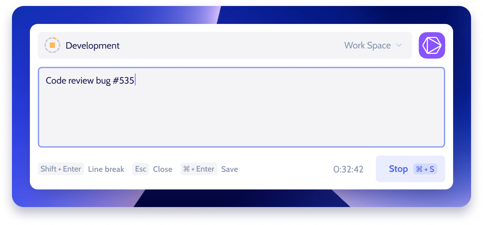 Fumbling around with browser tabs to find your time tracking software is no fun. Start/stop tracking with CMD/CTRL+E*. There’s no need to leave the app you’re in, so you can carry on working on your spreadsheet, coding, writing fan mails to Timeular…
