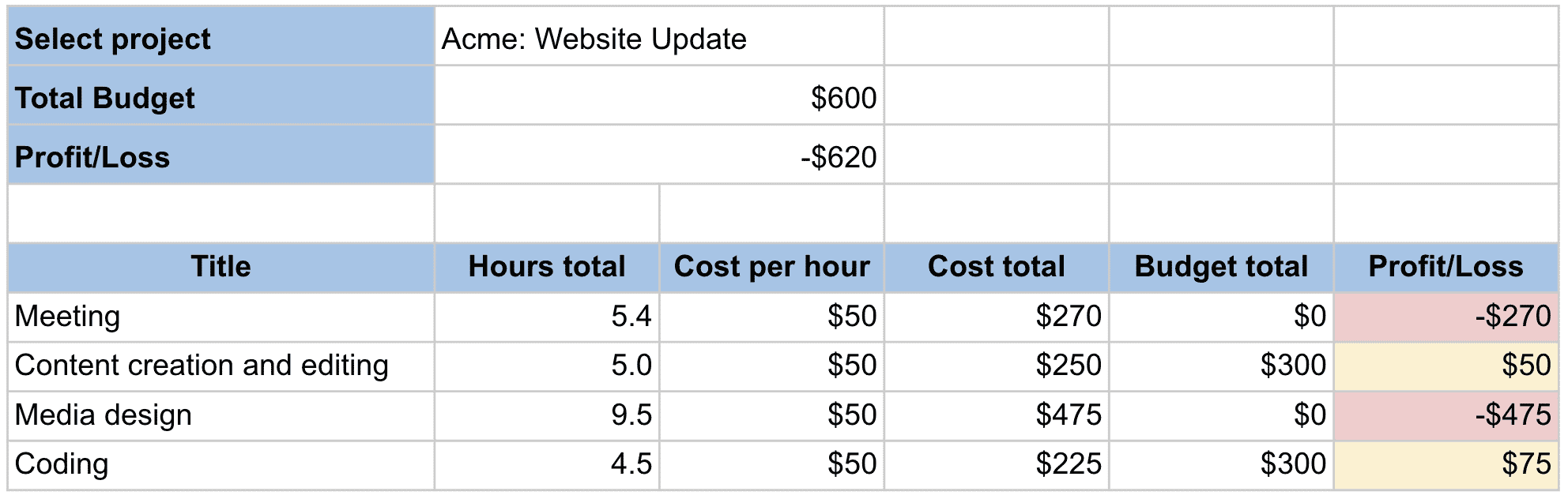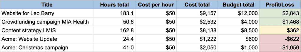 A quick calculation like the one below shows us that 2 projects are profitable, one is neutral, and two are unprofitable. Both are for the same client: Acme.