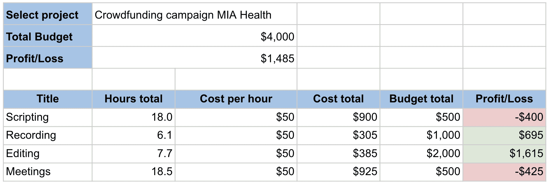 If we compare the totals of this project with our initial estimations we see that we just got lucky, as Editing and Recording was much quicker than we thought. On the other hand, we spent more on Scripting and Meetings than anticipated. Let’s note these insights down for a moment and see in the next chapter what to do about it.