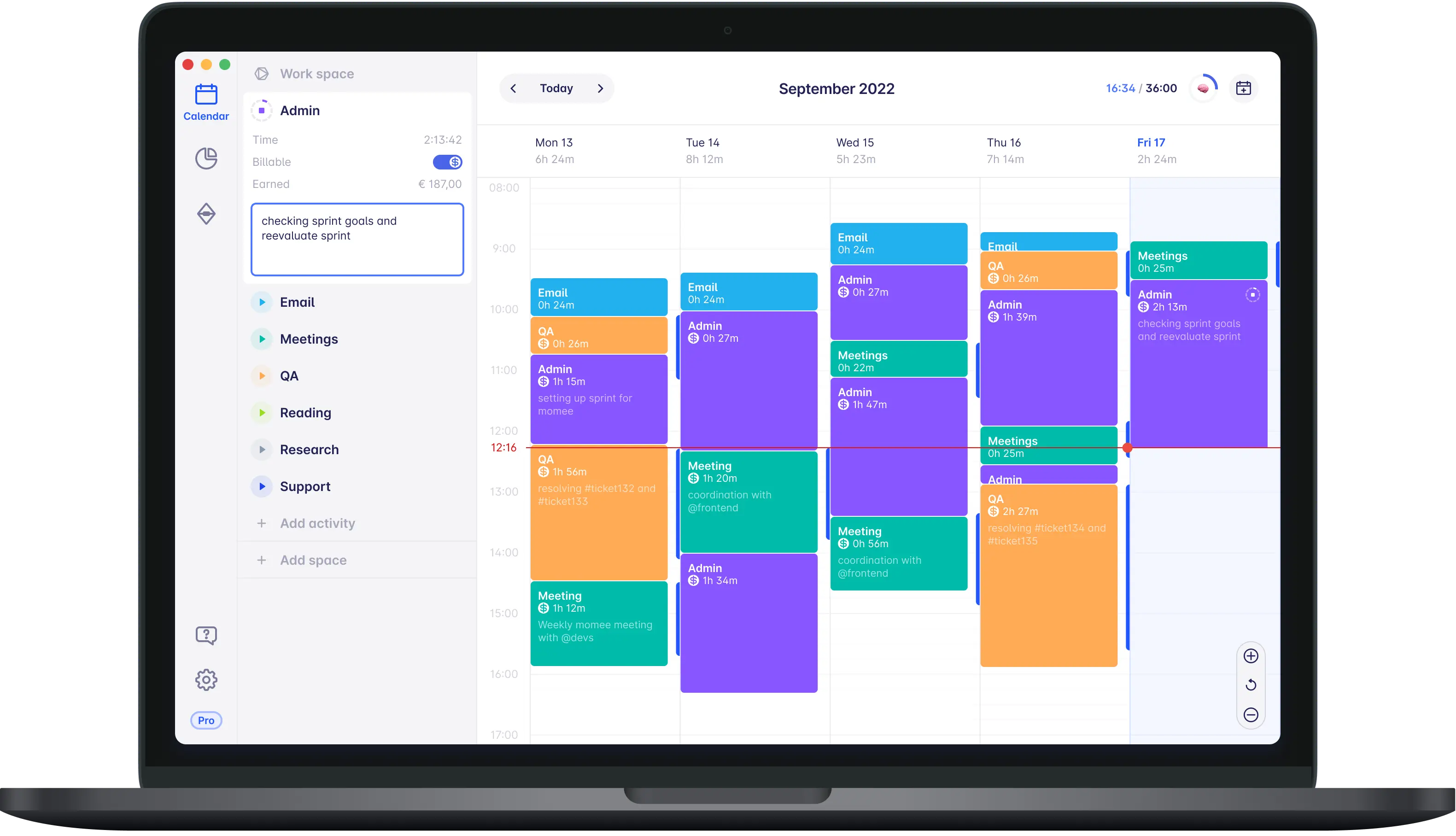 In Timeular, there’s a two-way integration between the tool and the calendars. You can export time entries from Timeular and import them into any Google, Apple, or Outlook Calendar, or you can import calendar events into Timeular. This last feature lets you see your events directly in Timeular’s main calendar view in read-only mode.