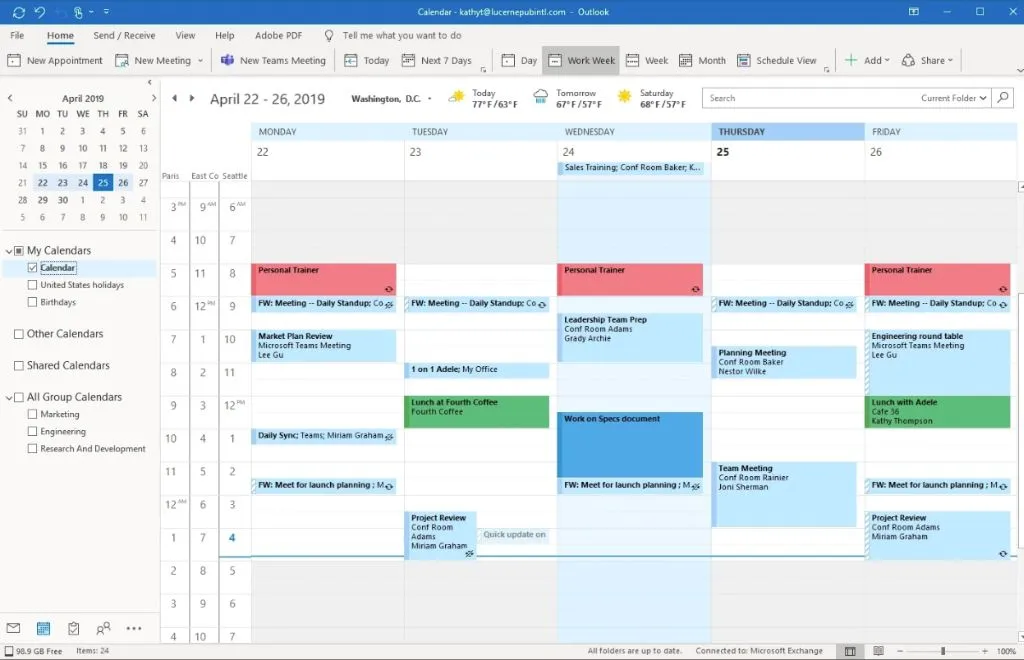Another great time-saving feature is selecting a group of people and seeing all their calendars overlaid on a single calendar.
