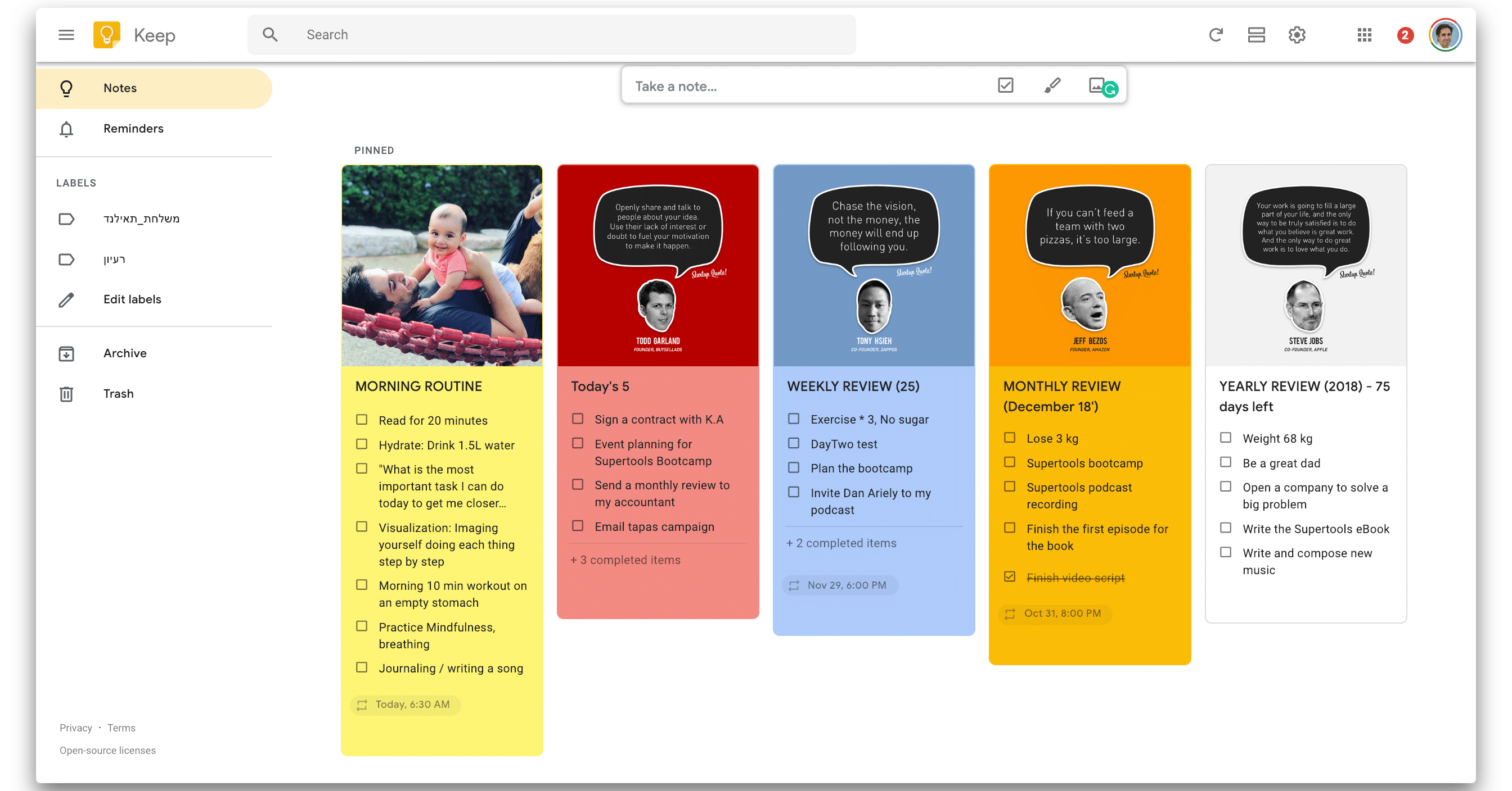 - Use Google Keep to not forget the big picture. Create your life dashboard on Google Keep. Create five cards: morning routine, today’s 5, weekly review, monthly review, and yearly review.