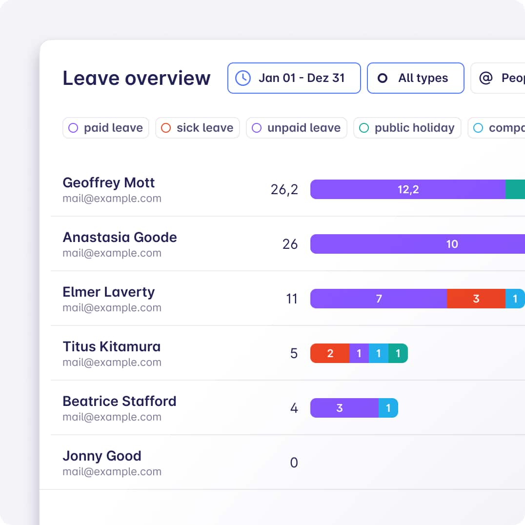Forgetting to track time with Timeular just got even harder. - Who from the developer team is on vacation? Is Ben here next week? When is Alice back? All those questions are now easier to answer with the new Timeline chart. It shows you all concurrent leaves in a beautiful time stream. Check it out in Insights > Leave and click on the calendar 📅 on the top right.