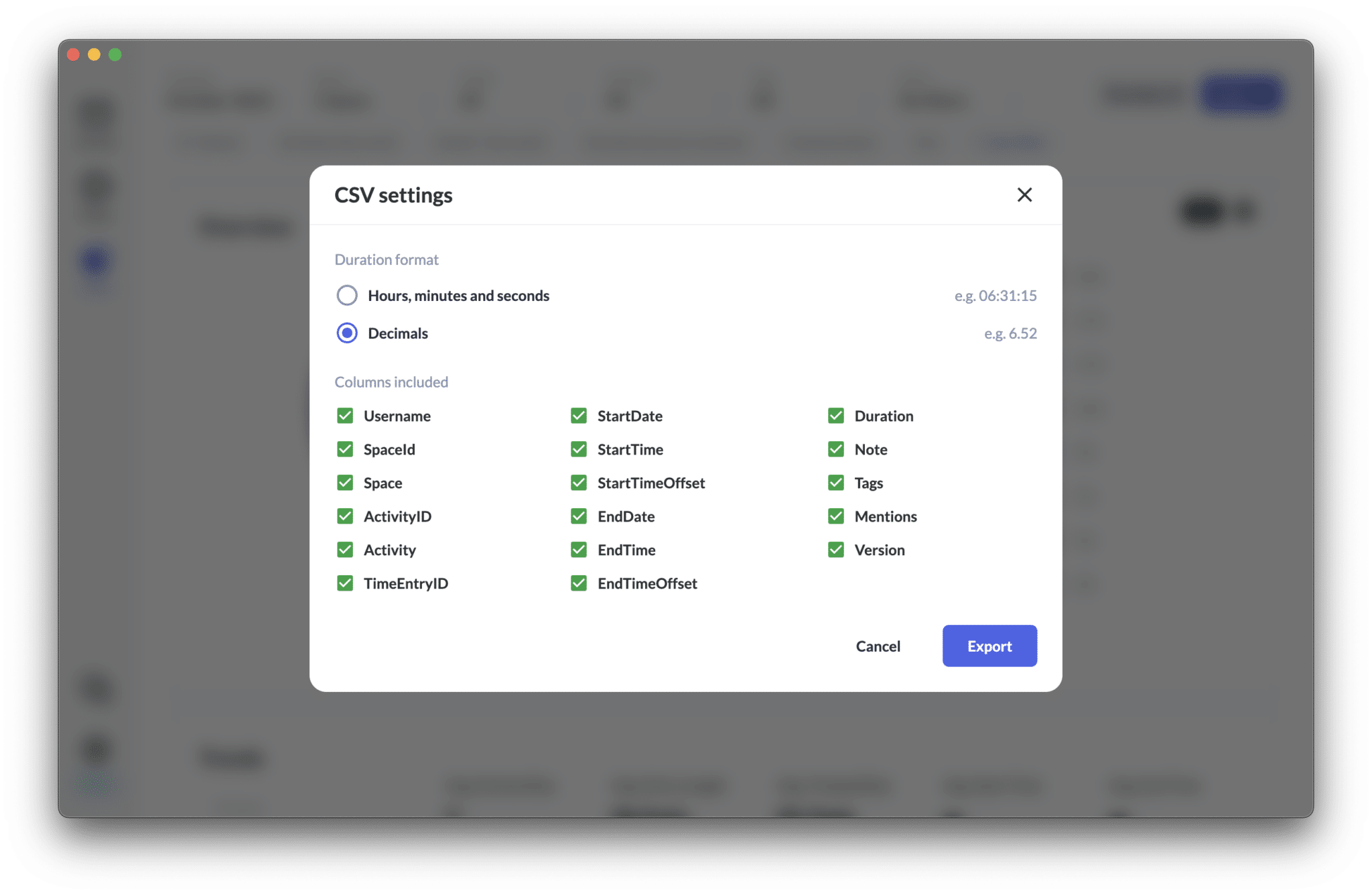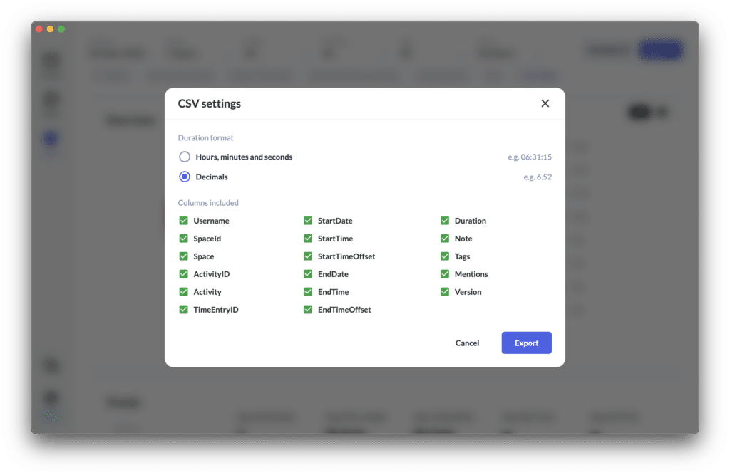 - We’ve added an option to customise the CSV and Excel export in our “Insights” section ⬆️ . You can now specify which data should be exported, the duration format and whether durations should be rounded