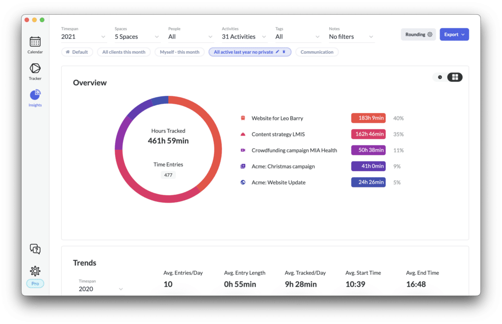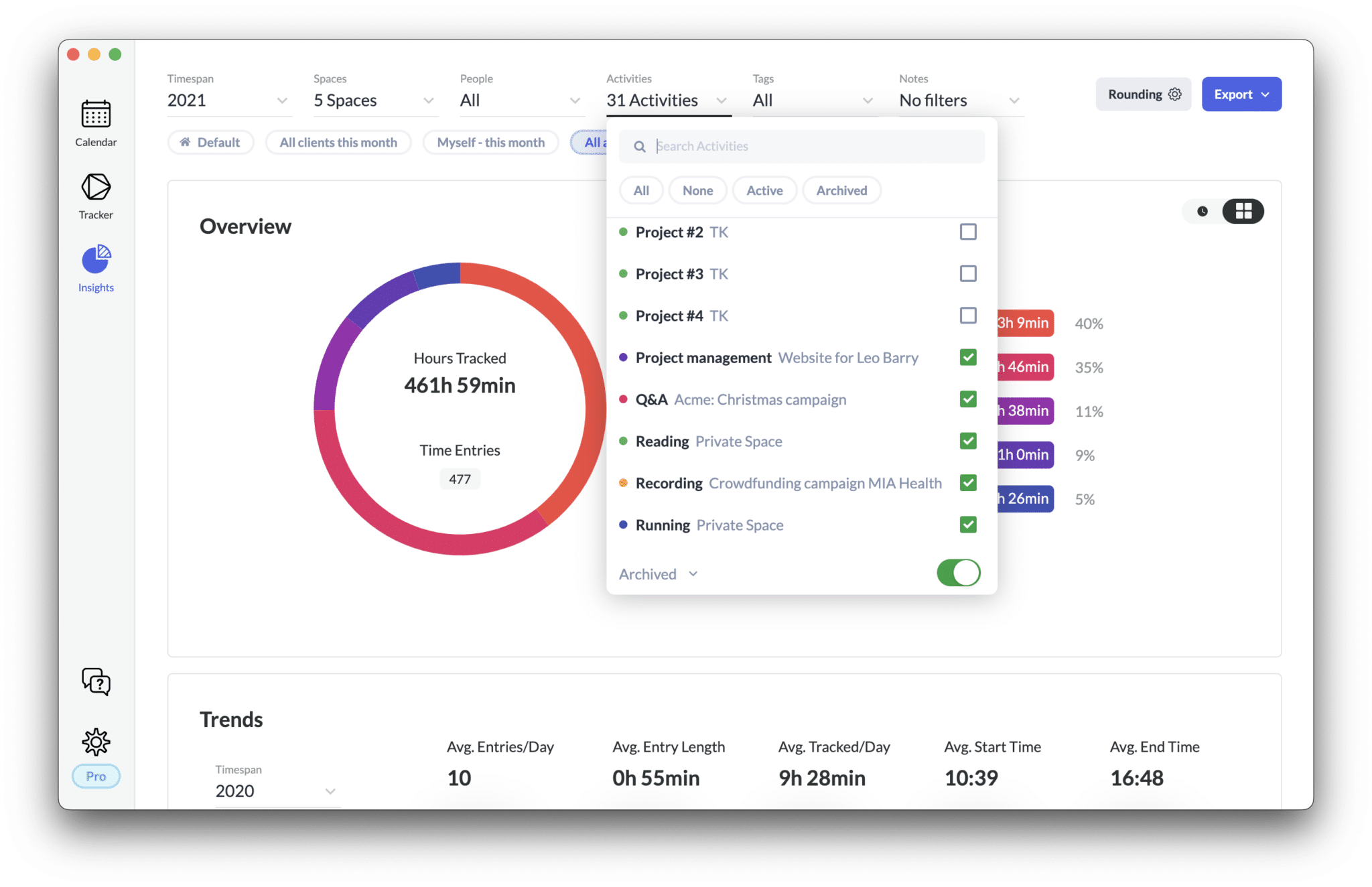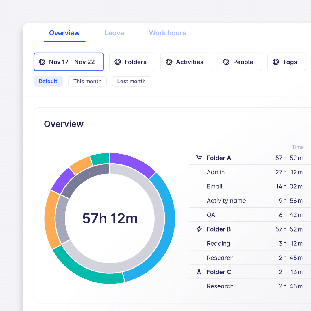 - We have good news for users with multiple folders. We’ve upgraded the top chart in the insights to show folders- and activities-insights simultaneously. You don’t have to switch forth and back anymore. See time spent on everything at a glance.