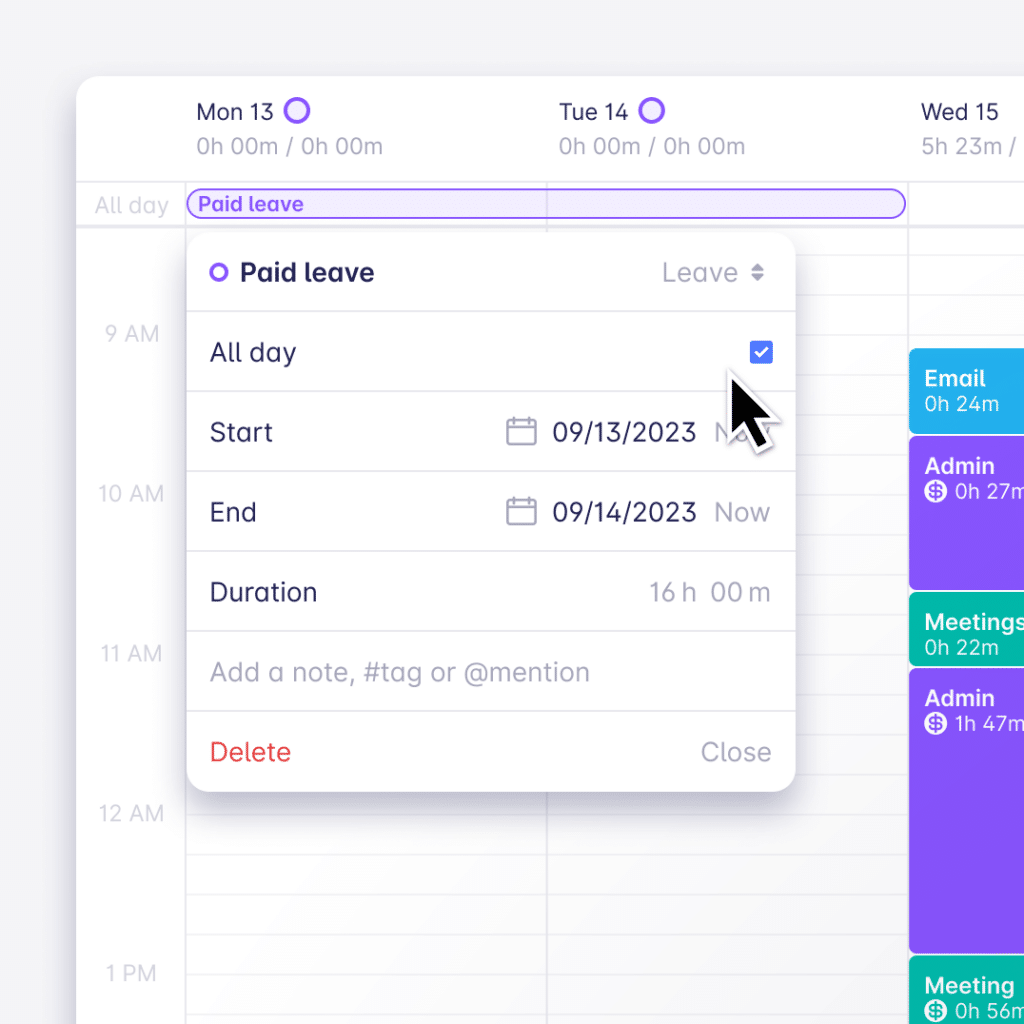 - To make entering a leave easy we had to re-design our time entry edit popover in the Calendar. We took the chance to make it smaller, easier to use, and less intrusive. If you have further suggestions, let us know.