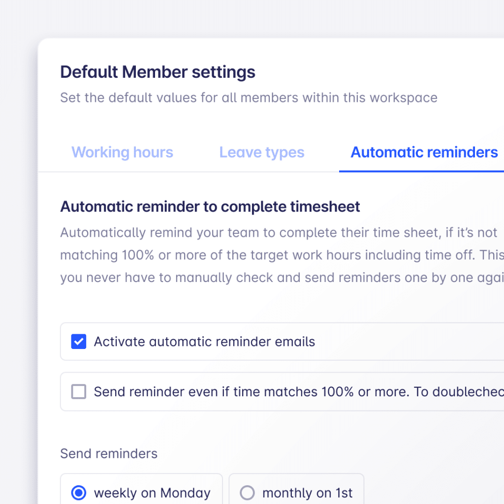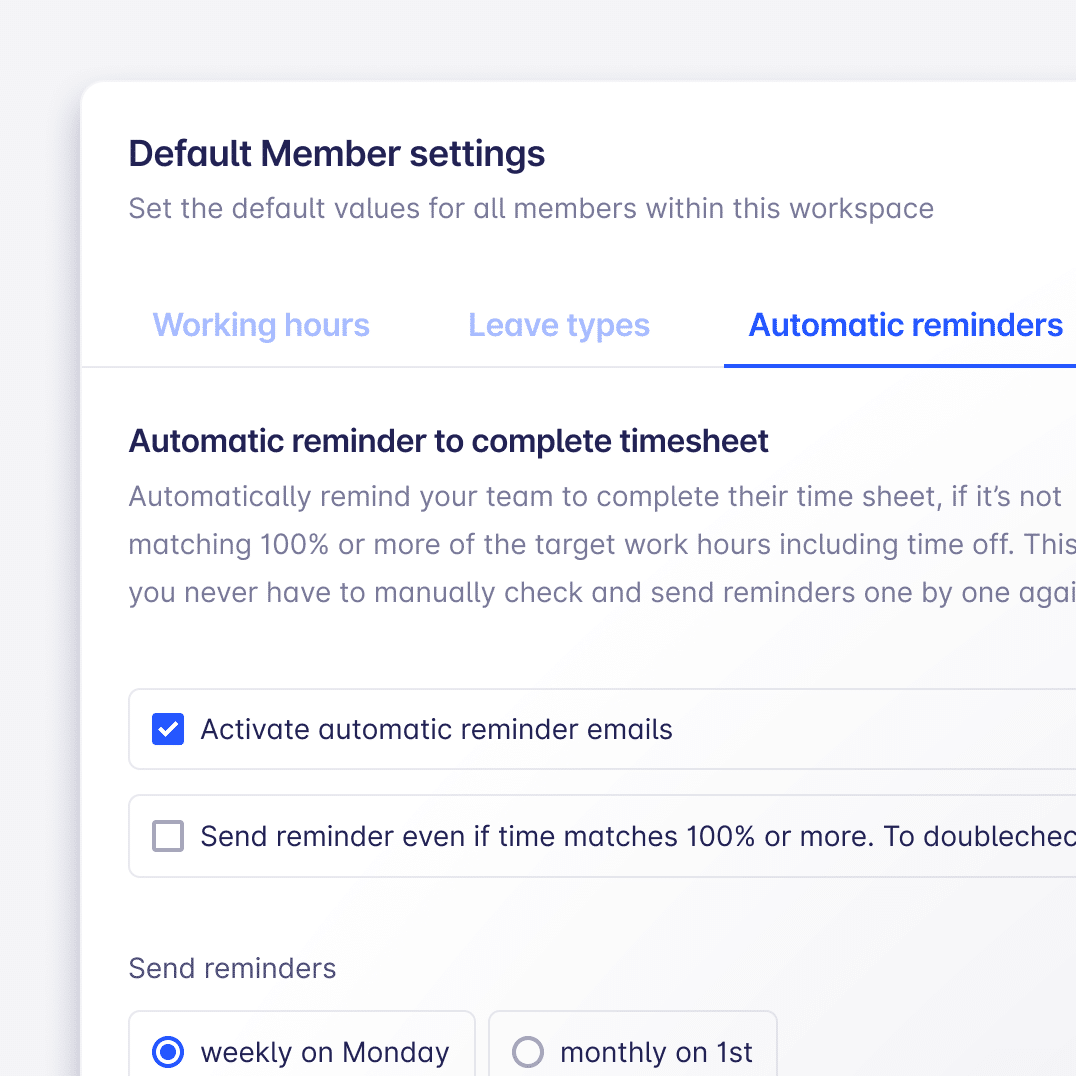 Soon, we’ll add more notifications, such as budget alerts. What else would you want to see in there? - Just in time for the approaching new year, you can now set default leave quotas for all members and disable certain types of leaves. You can customise the default settings for all new and optionally, existing members. To do so go to Workspace > Members > and click on the ⚙️ on the top right.